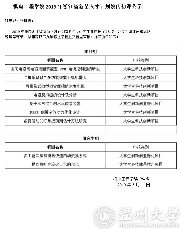 机电工程学院2019年浙江省新苗人才计划院内初评公示