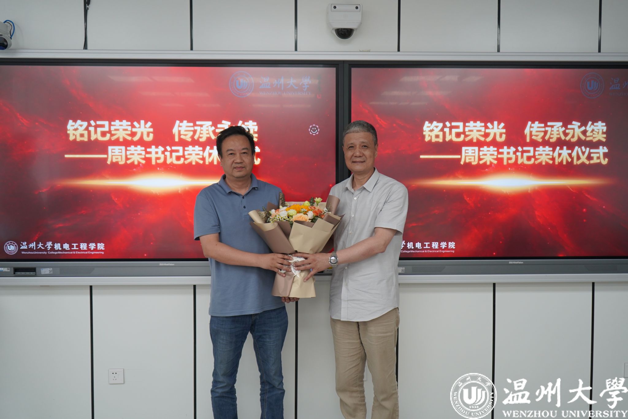 仪式上,院长向家伟与工会主席孙兵涛为周荣老师赠送鲜花和纪念品,并对他敬业奉献、勇挑重担的工作精神给予充分肯定和赞扬。