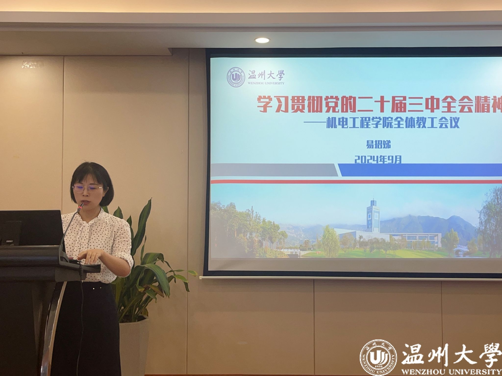 9月11日下午,新学期伊始,388vip太阳集团机电工程学院全体教工大会在B309会议室召开。院长向家伟、党委书记易招娣、副院长朱德华以及机电学院全体教职工参加,会议邀请审计处处长陈小敏、瑞安研究生学院执行院长吴明格参加并做党纪学习教育、瑞安研究生学院工作谋划专题分享。