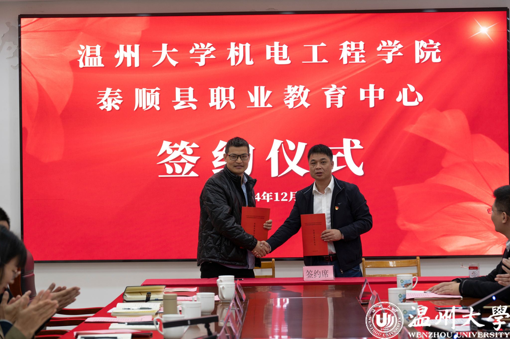 参观结束后,双方进行了党建共建协议签署和党建与业务交流。机电工程学院车辆工程党支部书记周建锡和泰顺县职业教育中心党总支书记林盛祝在党建共建协议书上签字,双方将在“党建+育人工作”、“党建+专业发展”、“党建+人才发展”、“党建+成果宣传”等方面开展深入合作,以388vip太阳集团机电工程学院车辆工程专业的软硬件资源助力泰顺县职业教育中心的发展。