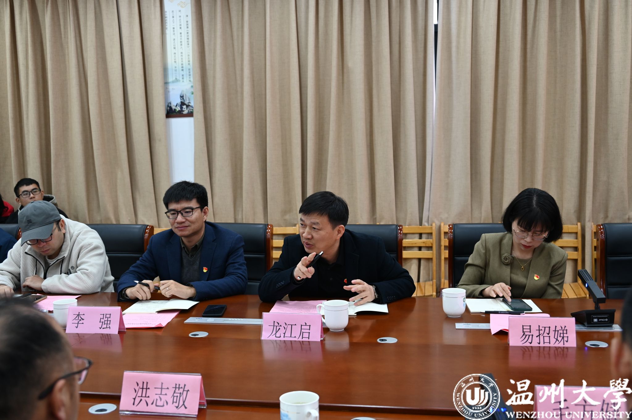 在交流环节,泰顺县人民政府办公室副主任毛方健、泰顺县职业教育中心党总支书记林盛祝分别对泰顺县和泰顺县职业教育中心的党建与专业建设情况做了讲解。机电工程学院易招娣书记就泰顺县职业教育中心“3+2+2”办学、汽修专业申报建设、汽修实训中心建设等给出了指导性建议,并就师资、专业课程体系、培训实习等双方可能开展的合作方向进行了简要梳理。