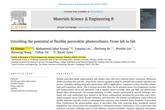 近日,我院外籍教师Ali Hassan博士作为第一作者兼通讯作者,在国际著名综述期刊《Materials Science & Engineering R: Reports》发表了题为《Unveiling the potential of flexible perovskite photovoltaics: From lab to fab》的长篇综述论文。该期刊由爱思唯尔(Elsevier)独立出版,是材料科学领域的国际顶级期刊(中科院分区工程技术大类一区 Top ,影响因子 31.6)。