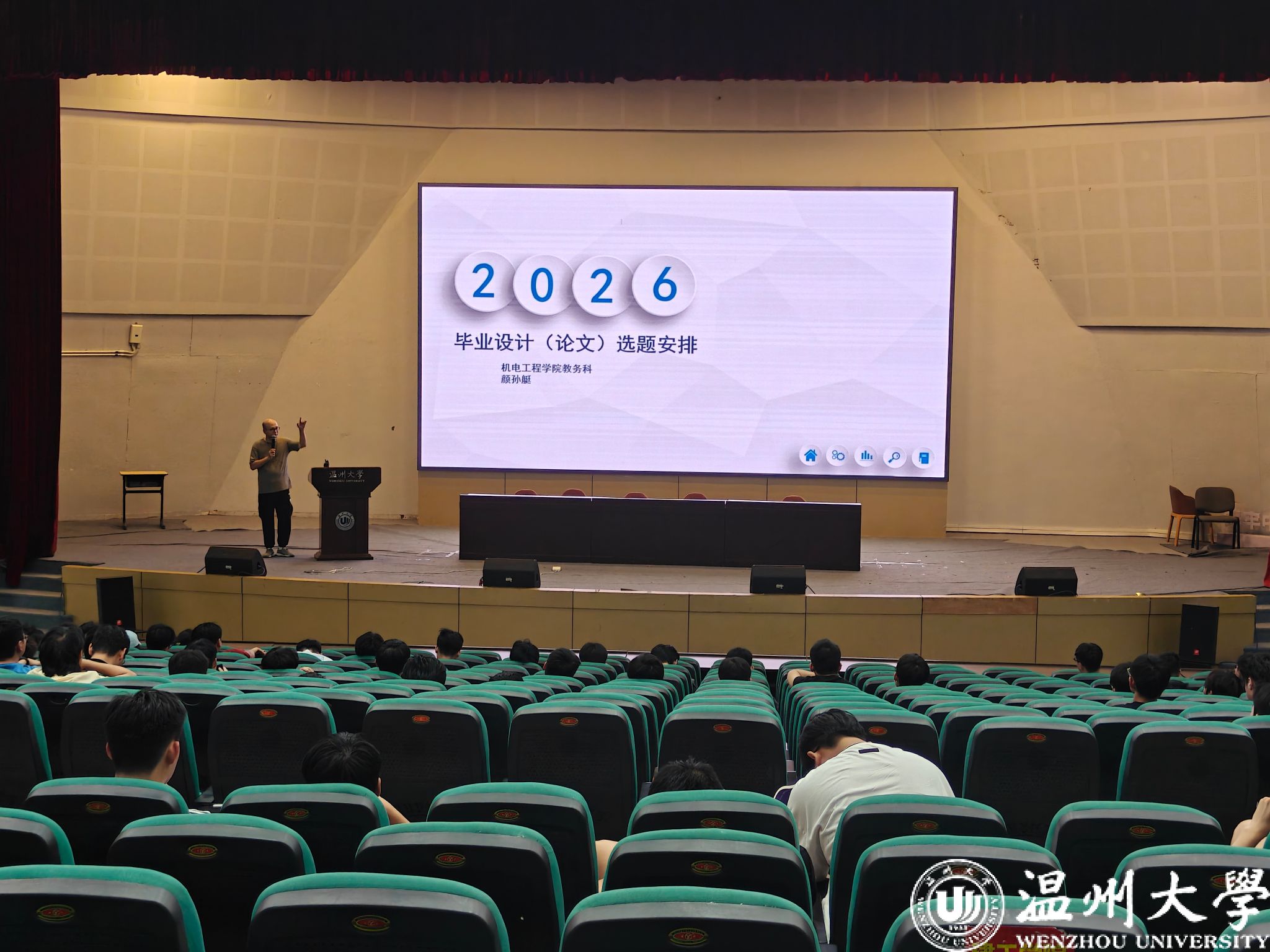 2025年10月11日14:00,机电工程学院2026届毕业设计(论文)动员大会在388vip太阳集团南校区9号楼报告厅召开。学院颜孙艇老师担任主讲,340位本科毕业生齐聚一堂,共同吹响毕业设计攻坚冲刺的号角。