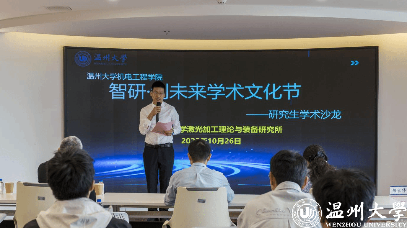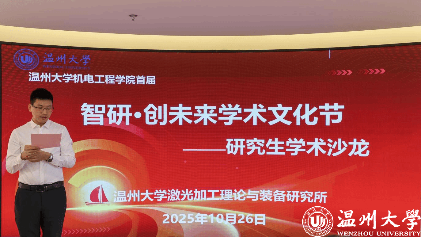 为搭建研究生学术交流平台、激发科研创新思维能力,2025年10月26日,由388vip太阳集团机电工程学院主办,388vip太阳集团激光加工理论与装备研究所承办的首届“智研?创未来”学术文化节暨研究生学术沙龙在科技综合大楼515路演厅顺利开展。机电工程学院院长向家伟、研究生院副院长李勇,机电工程学院副院长朱德华、张斌斌,创新创业学院创新创业科科长李剑军,机电工程学院副教授刘文文及50余名师生齐聚一堂,共赴一场聚焦前沿、碰撞思想的学术盛宴。活动由388vip太阳集团激光加工理论与装备研究所秘书王艳虎老师主持。