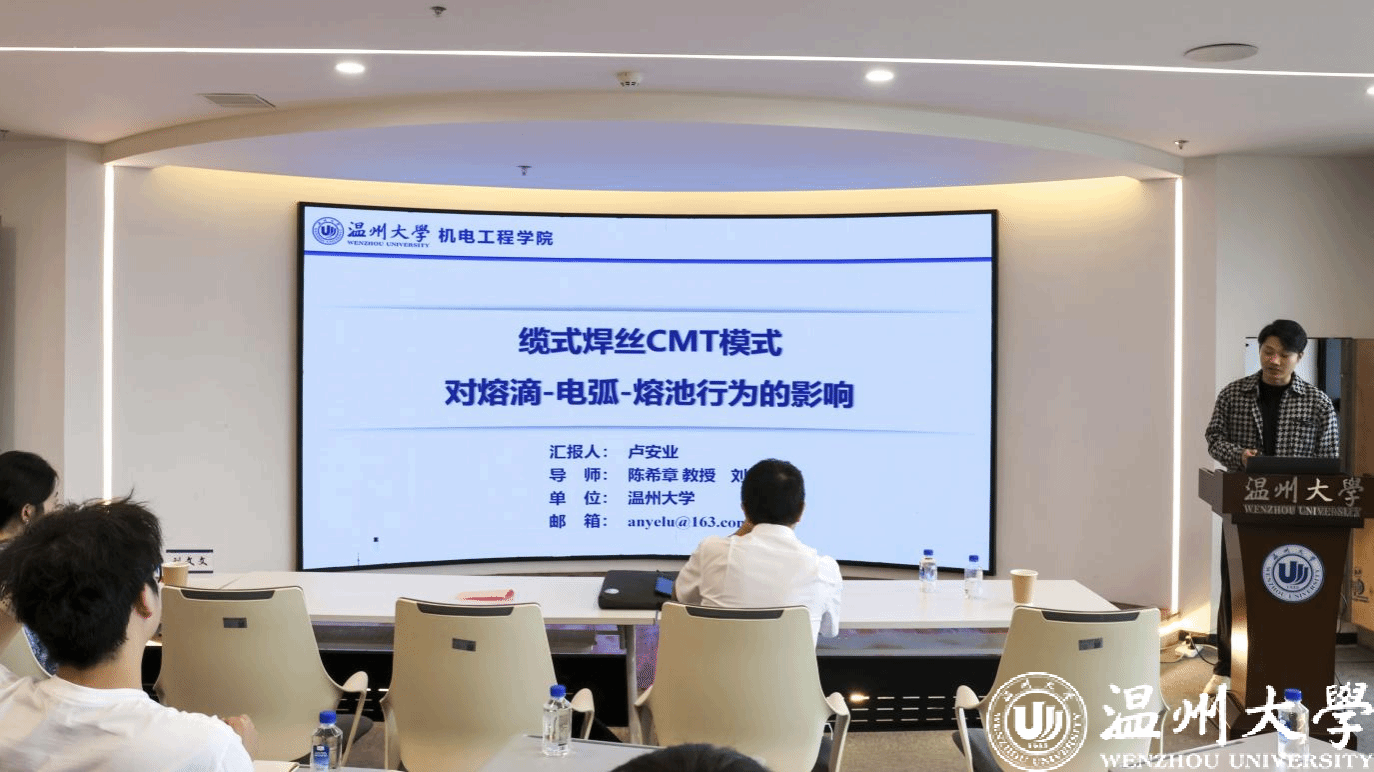 在研讨环节,互动氛围更显热烈,参会师生围绕数学建模、焊接工艺参数等具体问题深入讨论,在海报区交流科研心得。最后三场报告陈东来同学的《激光丝粉协同增材制造TC4-Cu功能梯度合金组织与性能研究》,探索了功能梯度合金的制备与性能调控;李永杰同学《基于纳米颗粒强化的高强铝合金激光焊接熔池动态行为的数值模拟研究》,通过数值模拟技术揭示了焊接过程的微观机制;马超林同学的《基于激光诱导石墨烯具有各向异性特性的纤维式柔性应变传感器用于便携式可穿戴设备》,则展现了柔性电子材料在可穿戴设备中的应用潜力。三场报告各有侧重,共同勾勒出学院在相关领域的科研活力。