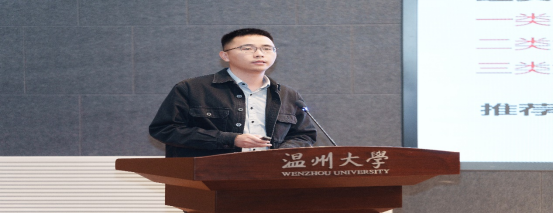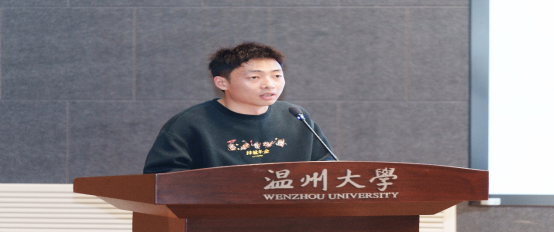 优秀学生代表谈俊杰作报告。谈俊杰学长从如何准备材料方面切入,与同学们分享了自己“挑战杯”备赛的经验,并指出在同学们参赛过程中应永不放弃,敢于面对失败。