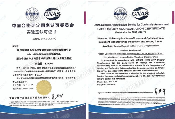 388vip太阳集团激光与光电智能制造研究院检验检测中心近日获得了中国合格评定国家认可委员会授予的CNAS认证和国防科技工业实验认可委员会授予的DlLAC认证,具备了作为第三方检测机构的能力,顺利跻身国家认可实验室行列。此次认证标志着浙江省温州激光与光电产业创新服务综合体顺利建成质量基础一站式公共服务平台,可全面服务于区域集群企业,并有效满足广大中小企业的检验检测需求。