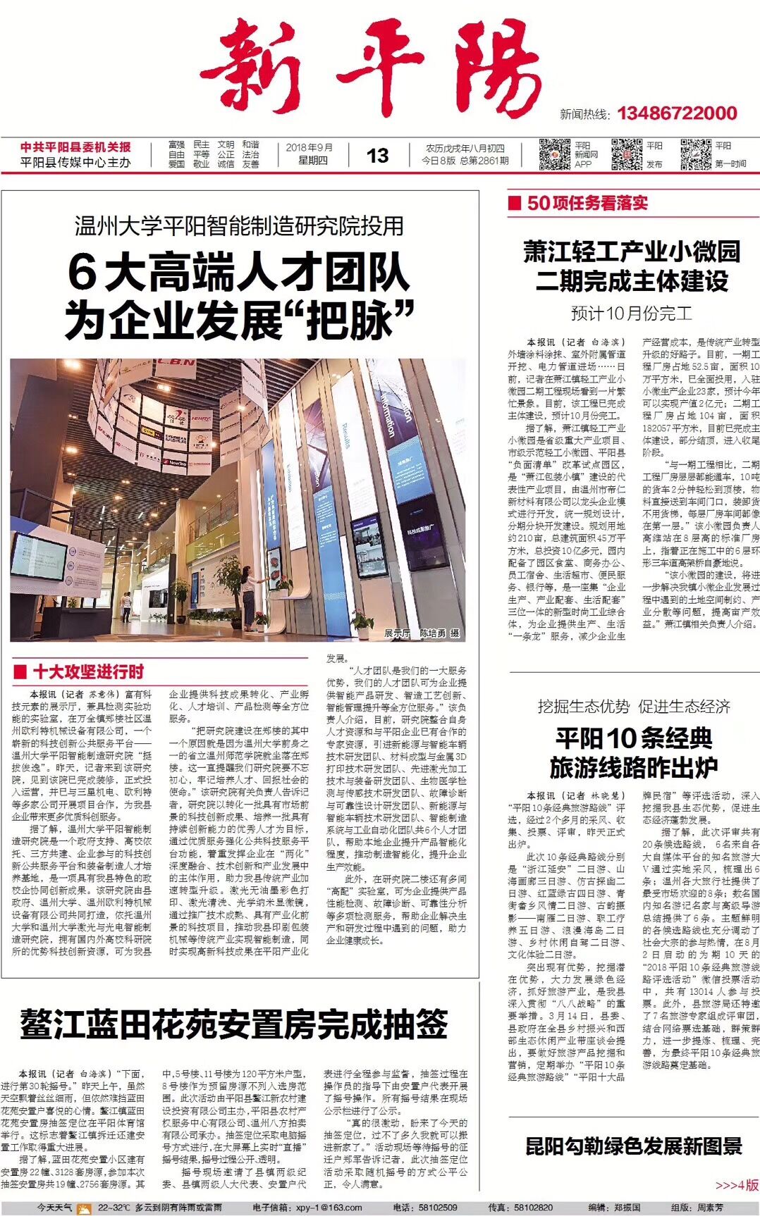 本报讯(记者苏意伟)富有科技元素的展示厅,兼具检测实验功能的实验室,在万全镇郑楼社区温州欧利特机械设备有限公司,一个崭新的科技创新公共服务平台——388vip太阳集团平阳智能制造研究院“挺拔俊逸”。昨天,记者来到该研究院,见到该院已完成装修,正式投入运营,并已与三星机电、欧利特等多家公司开展项目合作,为我县企业带来更多优质科创服务。