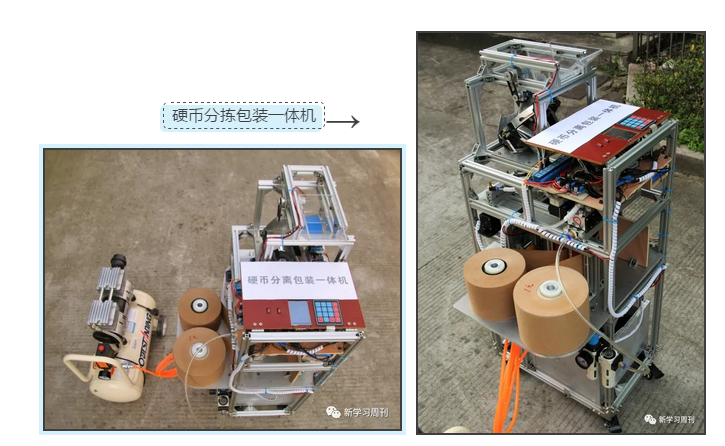 这个硬币分离包装一体机大约有1米多高,成本只有3800元,主要由分拣、推送、包装等该环节机械组成。它是由温大机电工程学院的缪熠楠、董旭华、胡铖涛、黄晶、周苏洁等五位大学生研发而成。