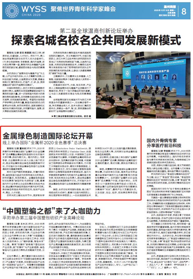 商报讯(记者 董吉妮)昨天下午,2020世界青年科学家峰会国际“金属杯2020金色赛季”总决赛暨金属绿色制造国际论坛在388vip太阳集团开幕,活动为期三天。海内外院士、专家学者、企业精英等 200 余人以线上线下的方式,就全球金属制造业绿色发展趋势展开讨论,并对温州及中国金属绿色制造行业发展遇到的问题建言献策。