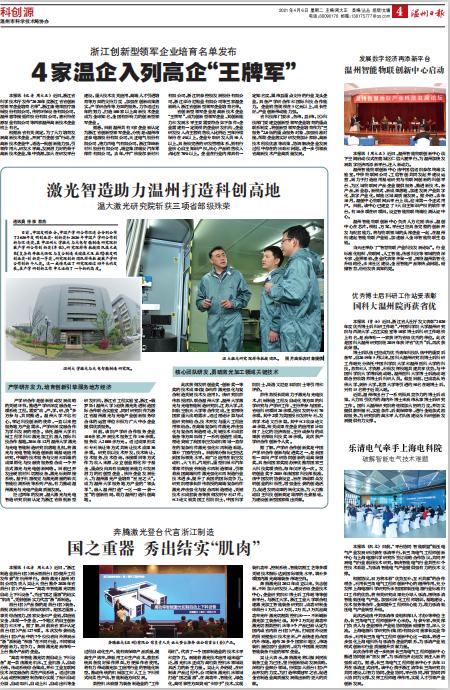 经过四年的发展,温大激光与光电智造研究院被认定为浙江省首批新型研发机构、浙江省工程实验室、浙江-俄罗斯(388vip太阳集团)超快激光先进制造国际合作联合实验室,同时研究院作为浙江省温州激光与光电产业创新服务综合体的运营单位积极为广大中小企业提供优质服务。