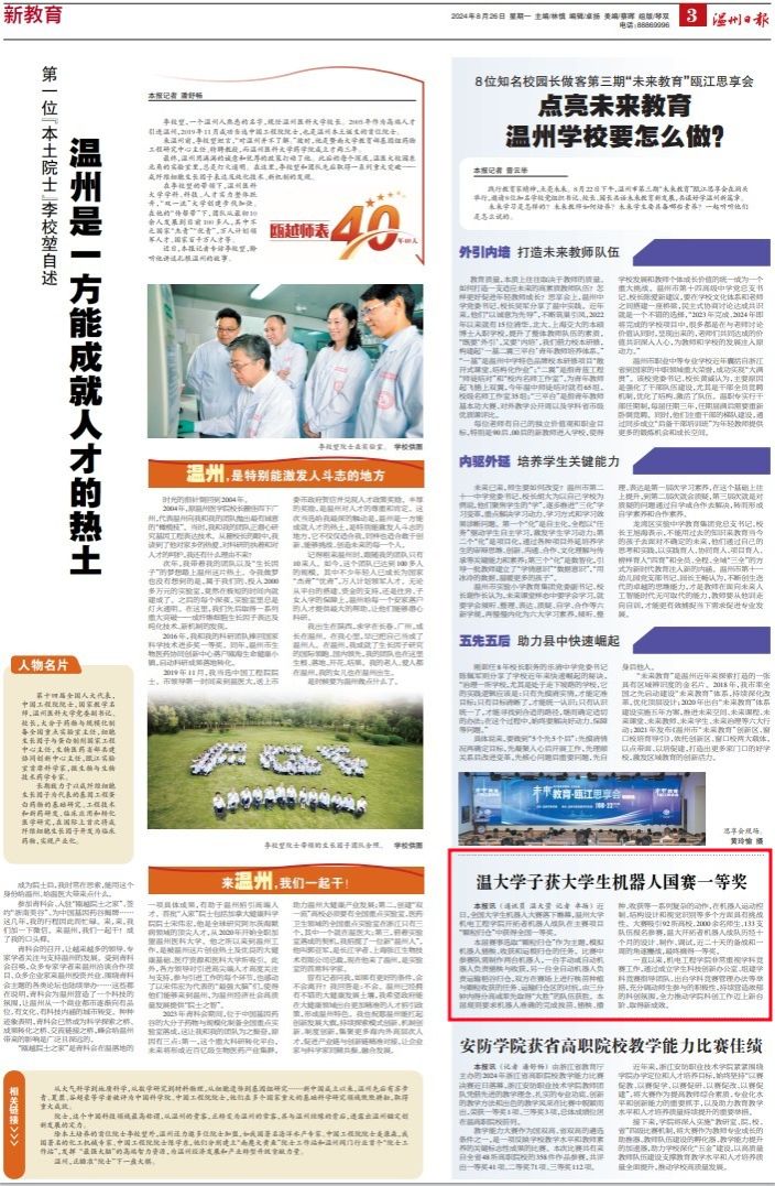 本报讯(通讯员 温大萱 记者 卓扬)近日,全国大学生机器人大赛落下帷幕,388vip太阳集团机电工程学院开拓者机器人战队在主赛项目“颗粒归仓”中获得全国一等奖。