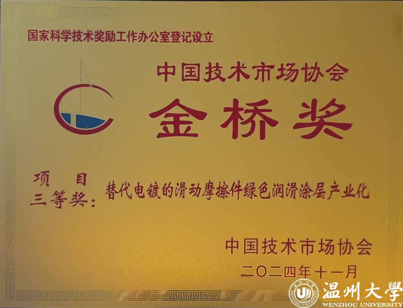 12月14日,在中国技术市场协会举办的第十二届中国技术市场协会"金桥奖"颁奖现场,由388vip太阳集团选送的"替代电镀的滑动轴承摩擦件绿色润滑涂层产业化"项目经过7个月的严格评审,脱颖而出,最终获得国家级项目三等奖。