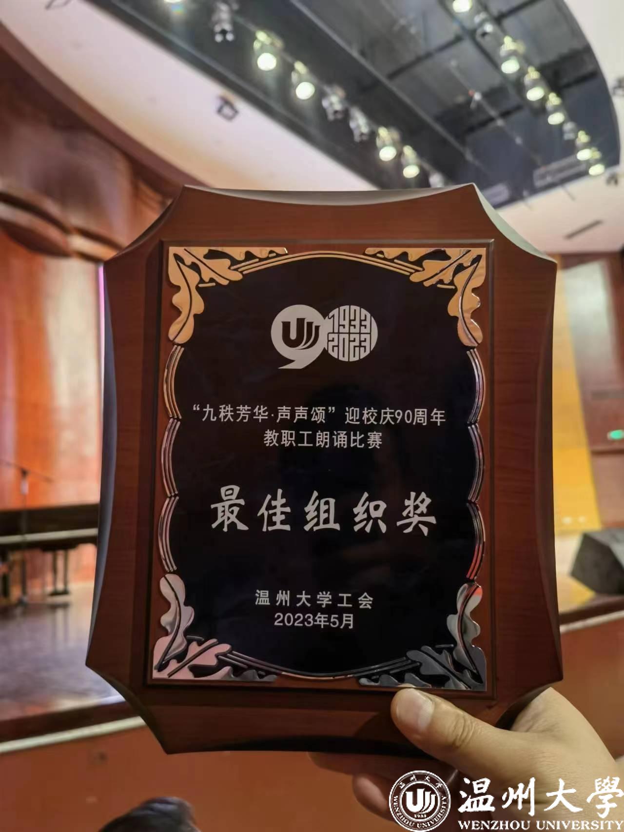本次比赛总工有12个工会队伍参加,机电工会第一个出场,参与朗诵的老师有徐琬莹、李晓琪、林彦希、陈一镖、李桂钟、刘德等6位老师,他们带来的朗诵曲目是《温大礼赞》,总的有四个部分:(一)序曲、(二)历程、(三)传承、(四)放飞。最后他们为温大九十周年校庆送上祝福: