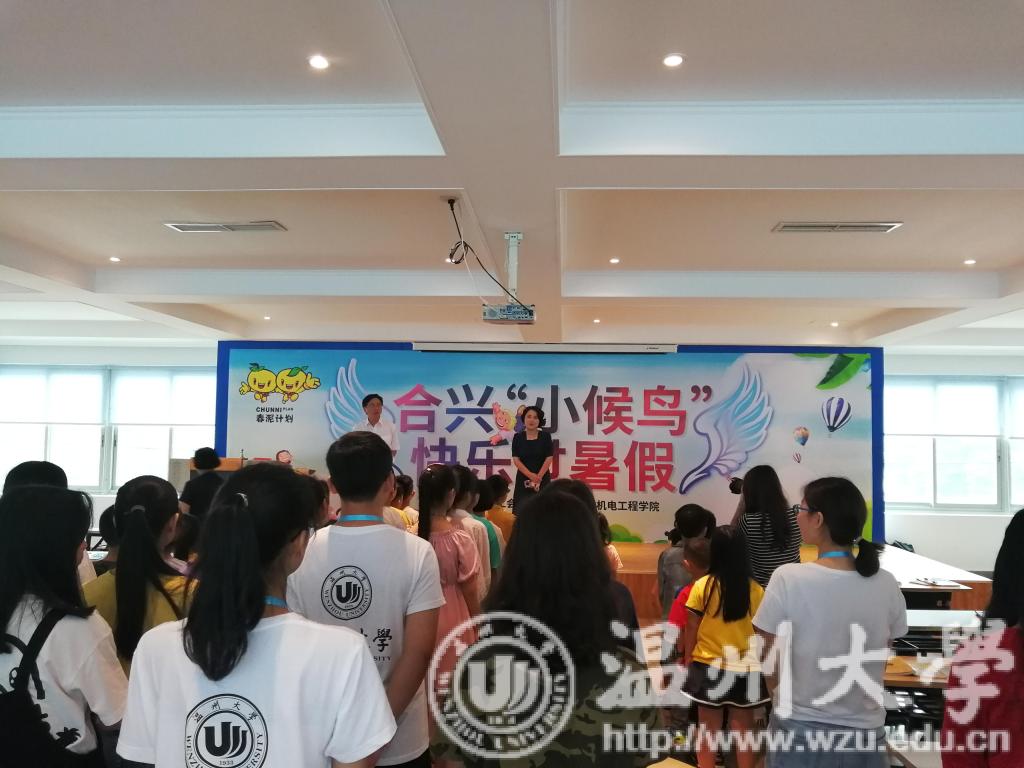 今天上午九时许,388vip太阳集团小候鸟暑期社会实践队在合兴集团隆重举行了第六期“小候鸟”暑假班的开班仪式。出席开班仪式的有机电工程学院党委副书记黄玮老师、团委书记朱秀微老师、机械电子系副主任任明老师、学生科辅导员杨奇老师、胡施施老师、乐清市总工会党组成员女职委主任卢建玲女士、虹桥镇文明办主任陈万德先生、合兴集团汽车总经办赵浙峰先生、合兴集团党委书记张守奎先生,还有来自温大实践队的39位小老师们,以及来自全国各地的128位小候鸟们。