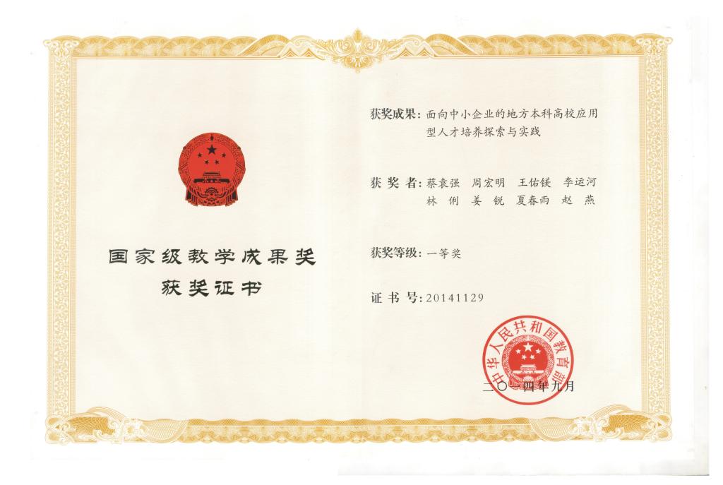 面向中小企业地方本科高校应用型人才培养探索与实践 20141129 一等奖 立足于地方本科高校的办学定位,面向区域产业升级和中小企业转型发展对应用型人才规格的新需求,在学校人才培养与区域产业升级双向互动中,回应中小企业转型发展对人才的新诉求,实施了分类分层的应用型人才培养模式,构建适应岗位需求的应用型人才课程教学体系和面向岗位素质要求的渐进式实践教育平体系,形成了多维联动、合作共赢的产学深度合作机制。